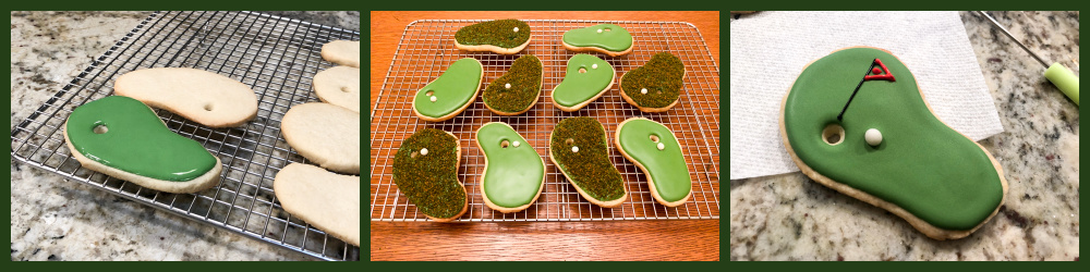 Last week my beloved went to play golf with a bunch of his buddies and took with him a batch of cookies to share after 9 holes. The idea was to give them a boost of sugar to hit that drive 50 yards further. Super simple design, you just need to make a template with a shape for the green to cut the cookies free-hand. The best way to make the hole is after they’ve been baking for about 7 minutes, get the baking sheet out of the oven and quickly stamp out the hole using a round piping tip. When you do that, you’ll get a nice rounded edge. I made two versions, depending on how you feel about icing, pick the first or the second.