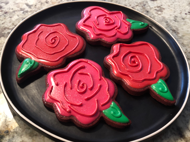 In this final version, I flooded the flowers and leaves (for flowers I used fuchsia from Sugarflair and Tulip Red from Americolor), let it set briefly (maybe 30 minutes), and added details with piping consistency icing. A little Diamond dust to finish them with some sparkle. Because… I am addicted to sparkle.