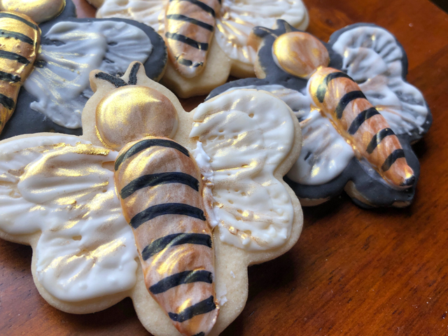 For Amy’s version, the wings were made with a brush embroidery technique. You can see her demonstrating the technique and making three different types of bees in this Facebook live (starting around the 17 min mark).The body uses what is known as pressure piping. The Royal icing is on the thick side, and you keep pushing it out of the piping bag and allowing some shape to take place, moving the bag gently up and down to create a bit of texture. The bodies of my bees were not too bad, my problem was the brush embroidery. The icing was not thick enough. I re-visited the technique a few weeks later, applying it to a different shape of cookie (briefly letting go of those training wheels). In the name of genetic diversity, each wing was a little different…