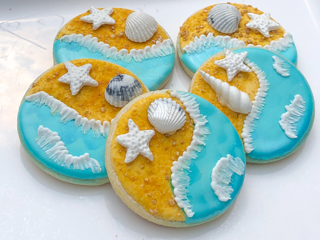 Some cookie projects are a complete pleasure, beginning to end. Once again I followed a tutorial from Marlyn (Montreal Confections). You can watch the basic process here, as part of a recent Live Facebook event. A full, detailed tutorial (with a nice supply list) is available in her Patreon page. The basic idea is quite simple: two colors flood the cookie, mimicking sea and sand. But then she brings the details, the real gilding of the lily. And the simple details turn each cookie into a fun, adorable beach scene.