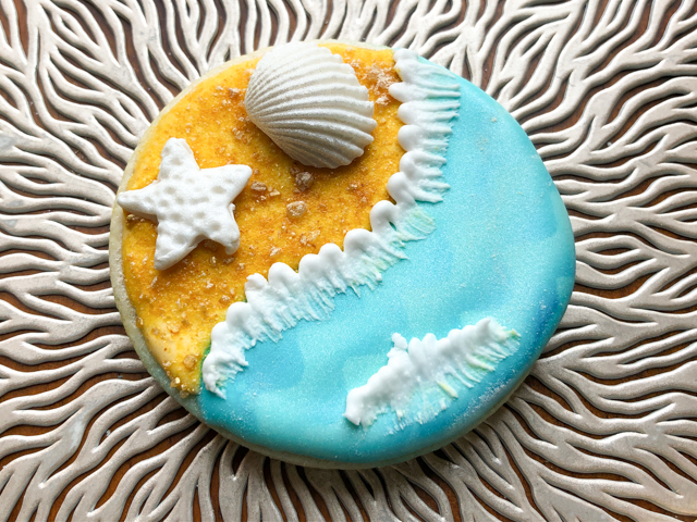 The sand component is added after the water part is fully set. I used Golden Rocks from Wilton, lightly processed in a mini-grinder. You can use Graham cracker crumbs too. Finally, brush embroidery comes in to play the role of waves. Just make sure that the Royal icing is in piping consistency and don’t use water in the brush because it can interfere with the air-brushing. It is all clearly explained in Marlyn’s tutorial, by the way.