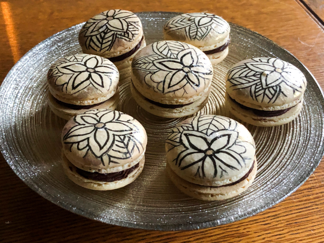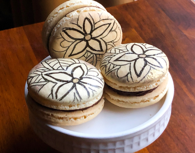 This was my first time using the mini-projector to decorate macarons. It is a little time-consuming but I love the overall look of the henna-design. Come to think of it, chai-flavored ganache or buttercream would pair well with this decoration…