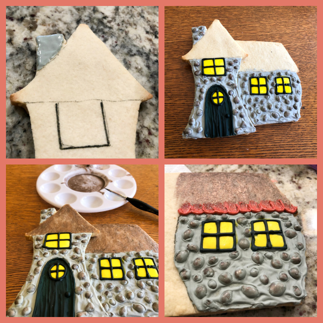 If you are serious about cookie decorating, I am sure you follow Amber, from @sweetambs. A while ago she posted a very special tutorial (exclusive to Patreon supporters) to make a Fairy Cottage cookie composition. A real masterpiece with quite a few steps. The thing that fascinated me the most was the pebble work on the surface of the house. You pipe each pebble individually as a Royal icing transfer, and then glue them to the cookie right after brushing some thick icing as a base. Each pebble is also painted with luster powder and vodka in black and brown, to make the final product even more realistic. I wanted to turn that into a pizza box concoction, so I reduced the dimensions of the house to fit inside the 7 x 7 inch box, and simplified the details a bit.
