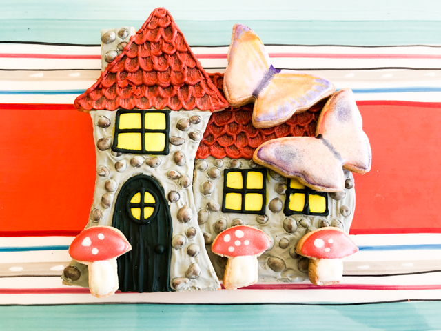 The two large cookies for the house were cut by hand, and I did the same for the small mushrooms, as I did not have any cookie cutter that would be compatible with the final dimension of the composition. Just make sure to keep an eye during baking because the small cookies will bake a lot faster.