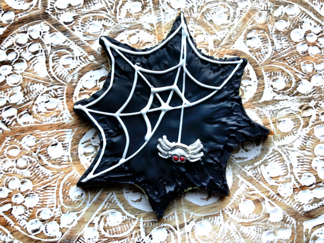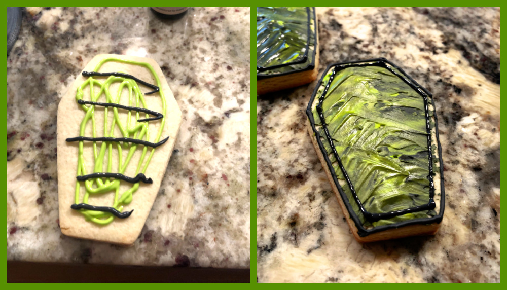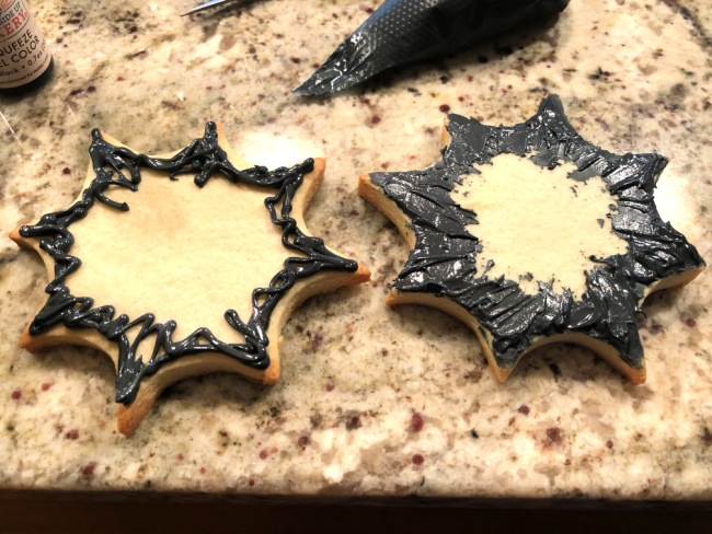 As to the background it’s all in the consistency of the black Royal icing, as well as the technique to spread it.