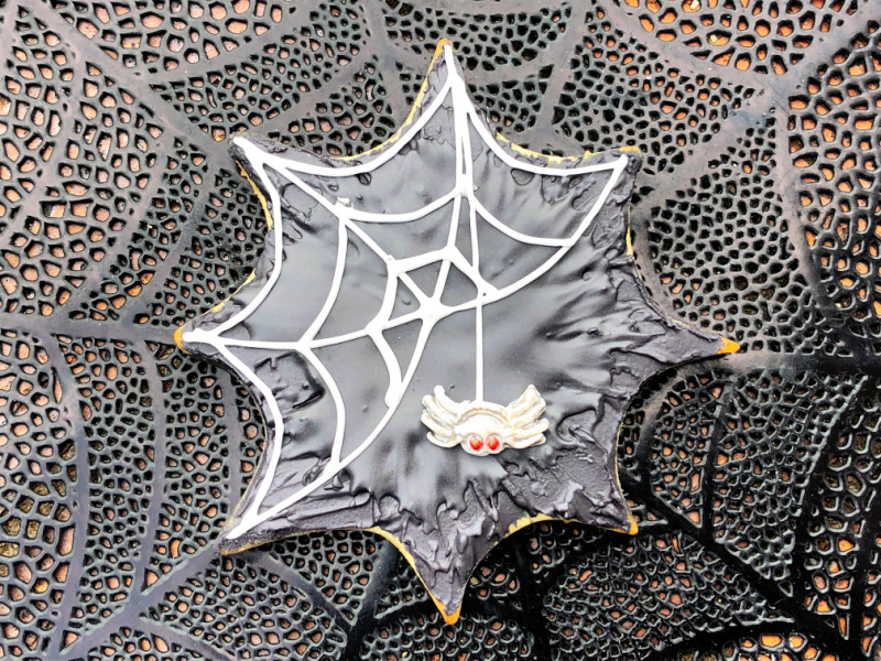 For the spiderweb cookie, Amy taught us how to give the background a nice texture, and all the details to pipe the web, how to get the dimensions correctly. I made my spider with fondant and dyed it silver. Eyes were tiny little drops of Rainbow Dust Metallic Red.