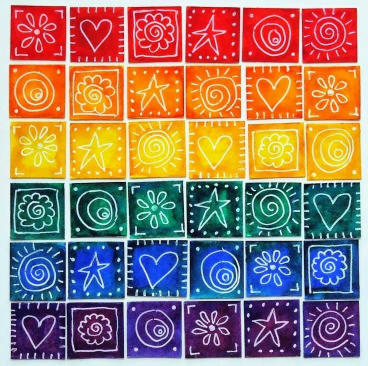 You start by choosing the colors for the base of your cookies. I’ve used four: yellow, orange, red and pink. Get a couple of egg yolks, whisk them, then separate in small wells, one for each color. Add a tiny amount of gel color to each well, and a little water (a drop or two) to thin the paint. Brush the color(s) to the surface of your unbaked cookie. Bake as you normally would. Let the cookies cool and, if desired, add details with piping consistency Royal icing.