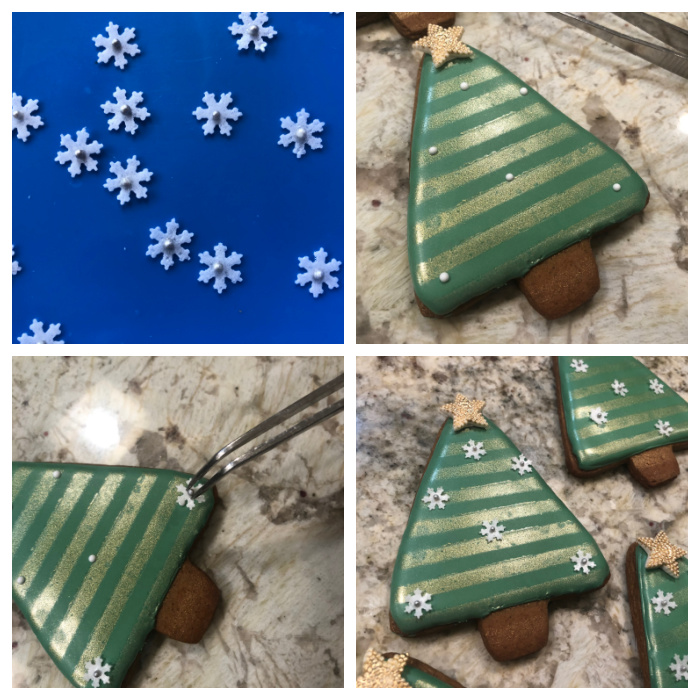 To make the snowflakes I used a puncher thingie (similar to this one) to cut wafer paper, then glued a silver nonpareil in the center.