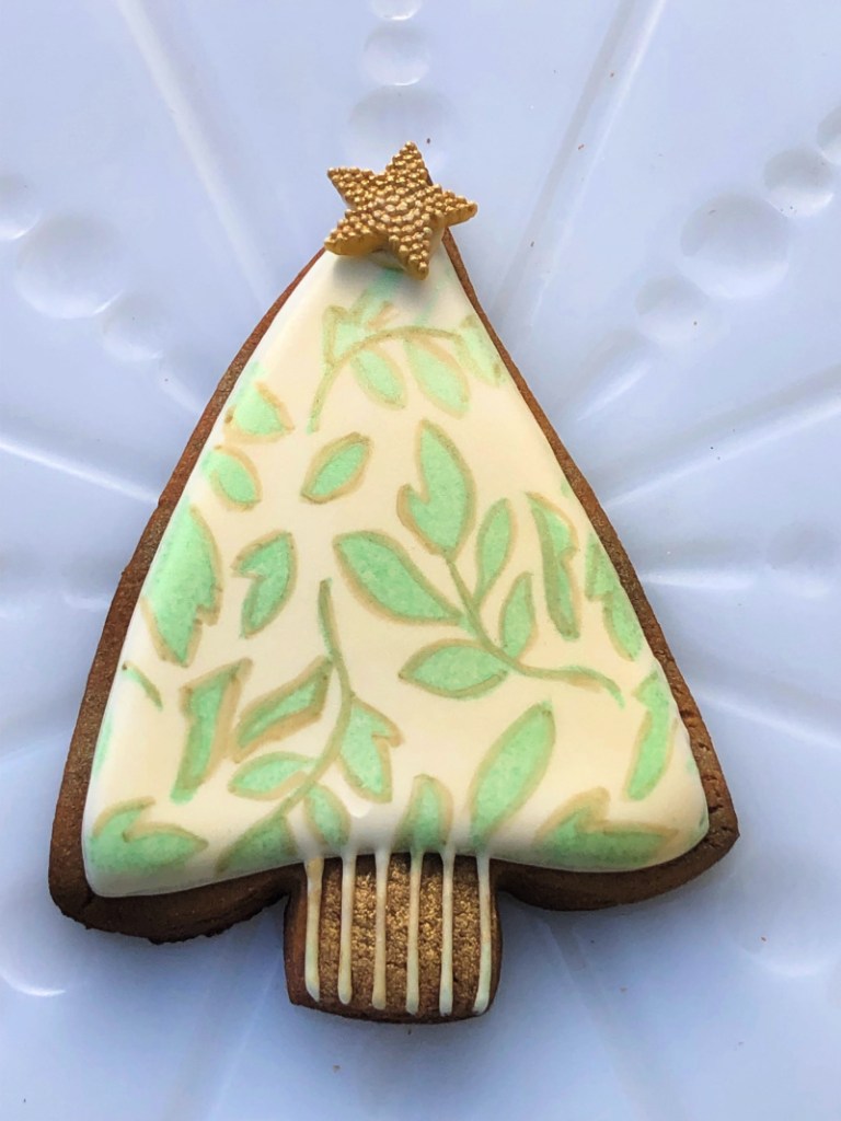 For another modern-ish version, after flooding the angled tree with white, I used a stencil to add a delicate leaf pattern. The design was made a bit more evident with a beige food pen, and gold luster powder added to the base and accent star. The whole cookie was then lightly sprayed with PME gold.