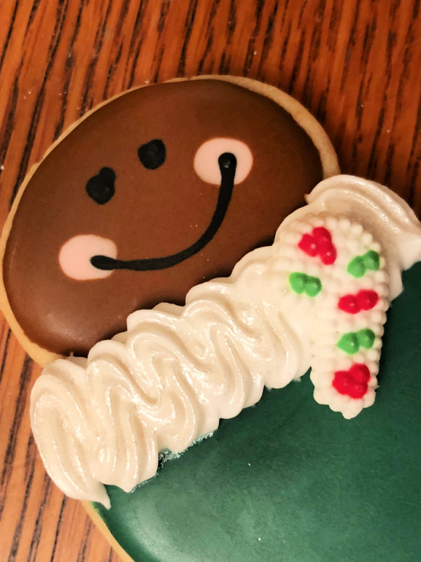 They were made after a video from Marlyn (Montreal Confections), using a “frankencookie” approach (watch it here). A sock cutter is combined with a little head to form the final design. From that point, it is pretty straightforward: ice the different areas, let them set. Pipe decorative lines with black Royal icing, and the detail on top of the sock with a star tip and stiff consistency icing. While that part is still wet, carefully place a mini candy cane as decoration. The eyes and mouth were made with a food-safe pen.