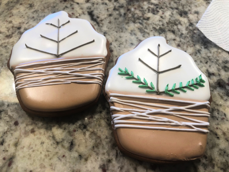 Piping ferns is a skill that comes in handy for countless cookie designs. It is quite forgiving, since you can add new layers in stages. A few red sprinkles (or royal icing dots) complement this look quite well.