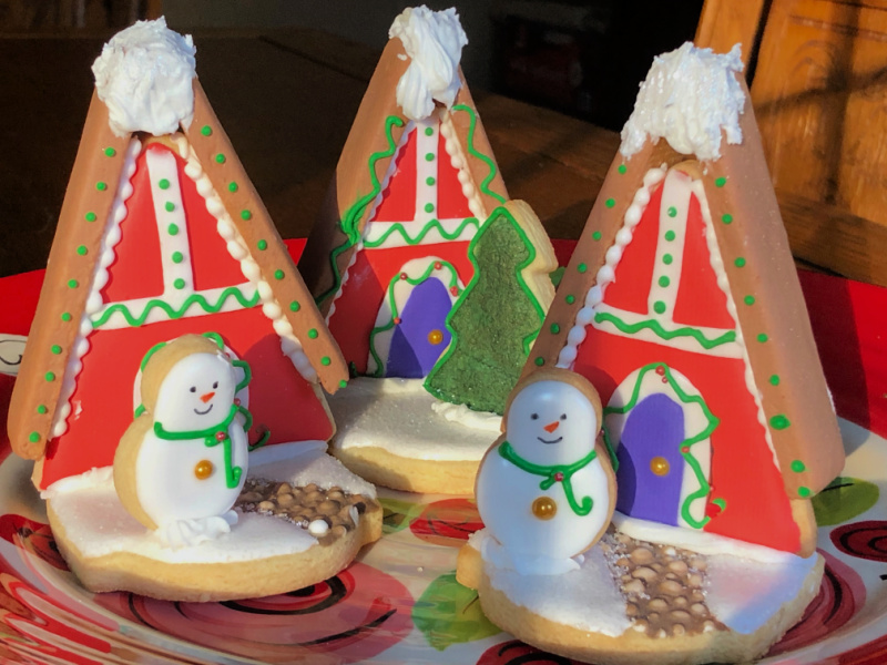 When I first made the cookies, the roof components would not align properly on top of the house, bringing back nightmares of what happened to me in a certain tent. Catastrophic developments that later were broadcast to a few million viewers. Family members and friends included. I quickly donated those roof parts for three very happy pups, and re-made them with more attention to overall dimensions. I used my roller cutter the second time around, and it worked like a charm.