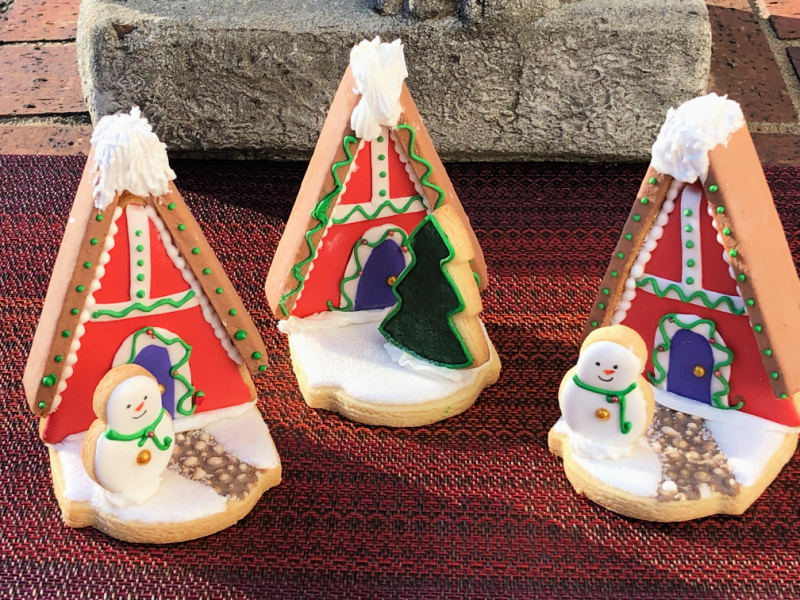 This set of cookies was fun to make but a little challenging in some ways. You must be attentive to the dimension of the roof components, particularly the thickness of the cookie. Those parts cannot be rolled too thick, they won’t look good and won’t assemble properly. The whole design was conceived and demonstrated by Marlyn (livestream video available in two parts, here and here). I simplified mine a bit, eliminating wafer paper decorations on the edge of the roof. One of my favorite parts of this set was making the rocky path in front of the door. Check out Marlyn’s version to be amazed!
