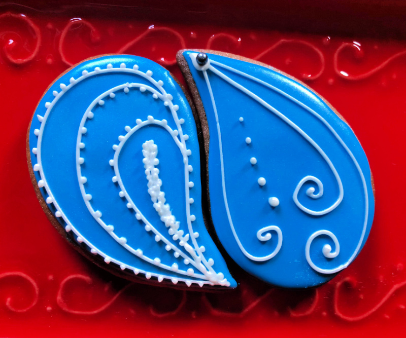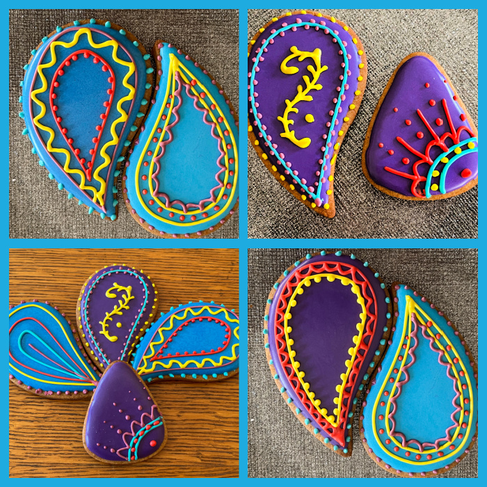 To make these cookies, I used a paisley-shape cutter, and flooded with purple or turquoise. Let that set for a few hours, then made small batches of several colors of Royal icing, piping consistency.