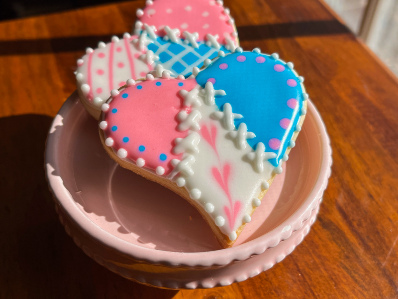 Another design inspired by many similar ones out in the IG-Pinterest universe. Divide the heart in sections, decorate each any way you want, let that set. Use piping consistency icing to add stitches, and a border. DONE!