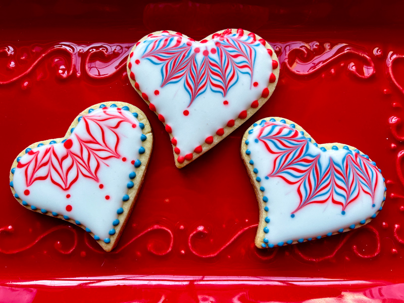 Not exactly a tutorial, but I’ve seen this type of design on Instagram and Pinterest, and improvised my own. Super simple, you start with a few lines and then use the needle to draw lines in both directions A few little dots close the deal. All wet-in-wet, which is the most forgiving type of sugar cookie decoration.