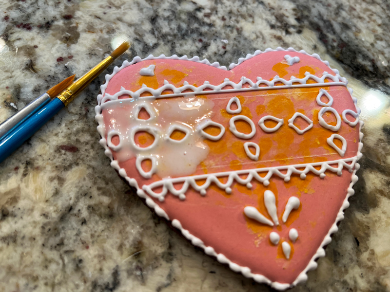 After piping the design, the opening is painted with a very dilute Royal icing. If you hit the consistency of the piping correctly, this is actually not too difficult. I’d say it looks more complicated than it is, but of course, I still need practice, as my fine lines were just a tad thick.