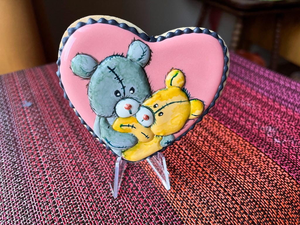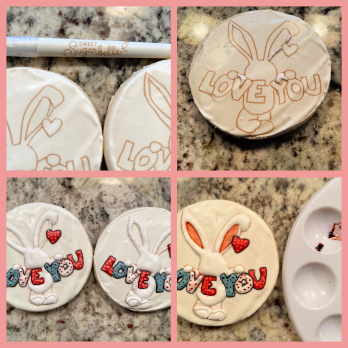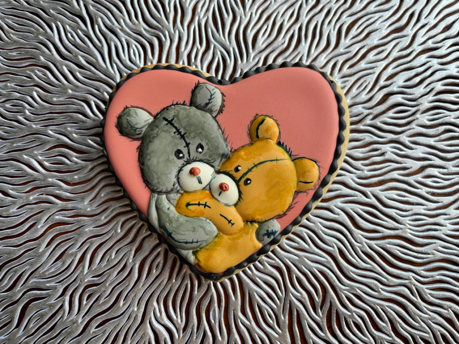 Below you see the basic steps to make the hugging bears… Flood the base with pink, let it fully set. Draw the basic outline and fill sections that do not touch with icing, allowing each section to set before moving to the next one.