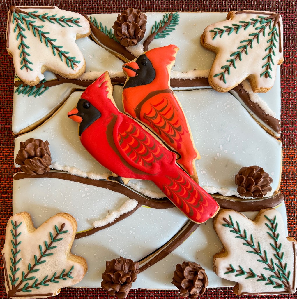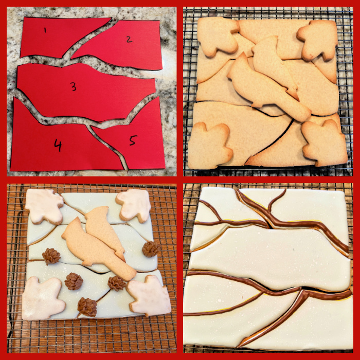 Let me walk you through the steps… It all starts with baking the base cookies cutting them according to the template that Marlyn designed. Additionally, two cardinal cookies that will fit together, and the decorative corner pieces.
