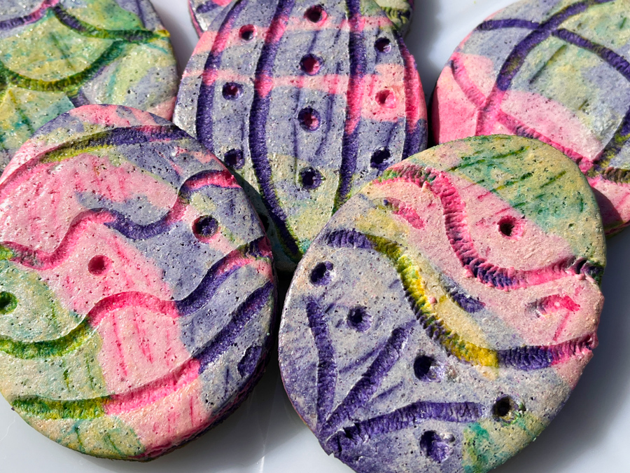 Get your favorite cookie dough recipe, make a batch and divide it in three. Use food gel color to dye each batch with a color of your choice. I used green (with some yellow barely mixed into it), purple and pink. Then roll each piece of dough as a log, place them side by side and marble them. Not too much so that the colors don’t mix. Check Marlyn’s video for all the details. Roll the dough as you would normally do, and cut the shapes. After that, mix some white food gel with egg white, whisk and brush a light coating on the surface of the cookie. Immediately use the clay sculpting tool to cut patterns that will expose the dough underneath. That is all you need to do. Bake and admire the results!