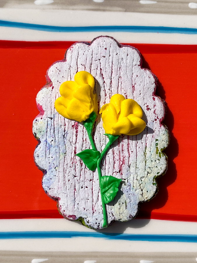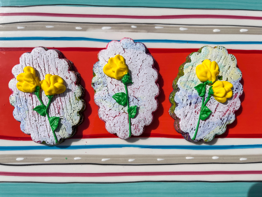 For these cookies, before baking I brushed a thin layer of Americolor white food gel. It must be Americolor, or it won’t work the same way. I should have brushed slightly less dye, make a thinner layer, so that the effect would be more evident. But the general idea still worked. Once they were baked, I added a few decorations with Royal icing, medium-stiff consistency for the stems and flowers.