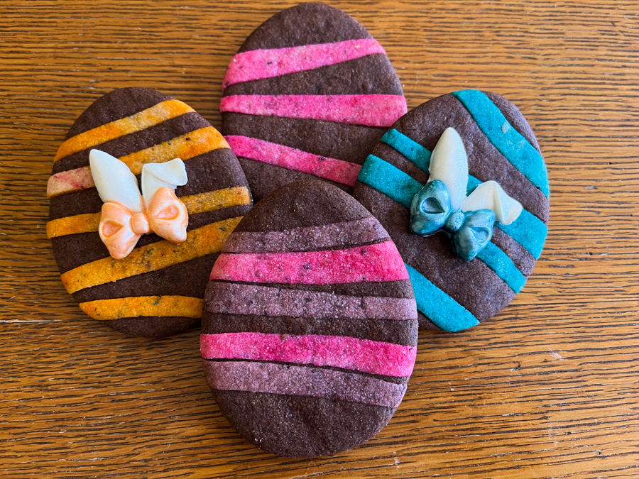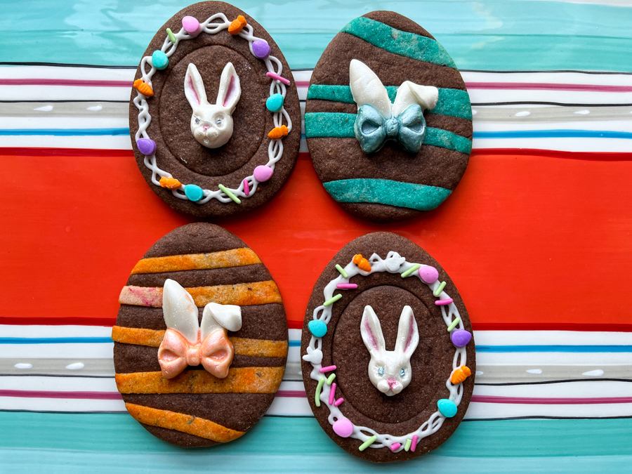 I baked several egg-shaped chocolate cookies and used them in different designs on the same day. For the stripes, you need to roll dyed cookie dough super thin and freeze the stripes, as Marlyn demonstrates in her video. Then, the frozen stripes are placed on your room temperature cookie, gently rolled to press, and cut. Using a plastic wrap between the cutter and the cookie gives a very nice rounded shape. Marlyn comes up with details that are simply brilliant!