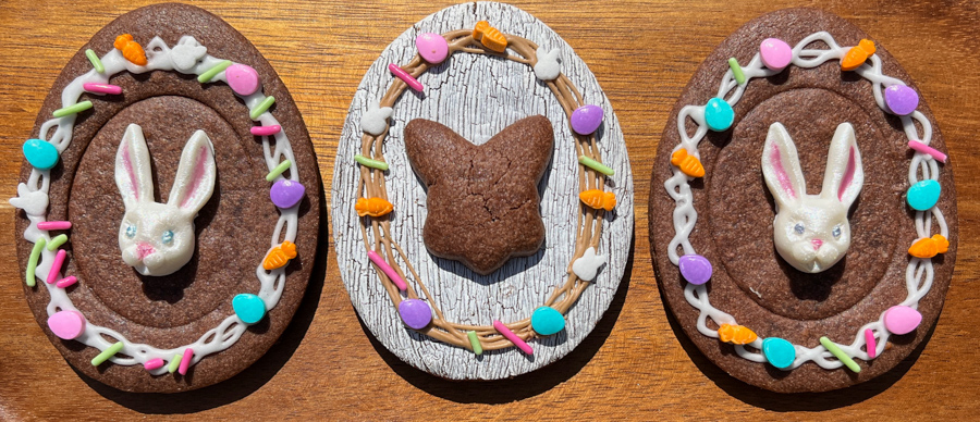 Another simple way to decorate is adding fondant shapes, and a little border with Royal icing and sprinkles. The smaller oval around the head of the bunny is made with a smaller cookie cutter gently pressed in the raw dough right before baking.