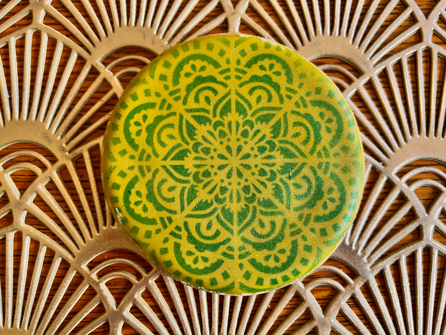This series, with a mandala-design was made with stencils and air-brushing. I think she would have appreciated both the patterns and the colors. They were flavored with Chai extract from Olive Nation, and a touch of vanilla.
