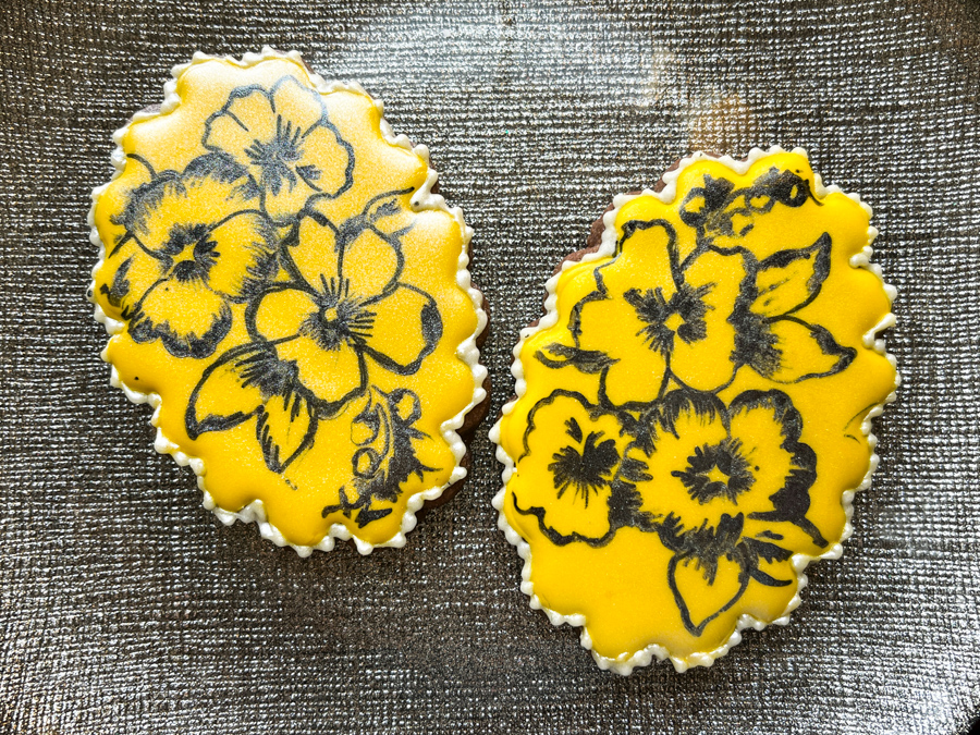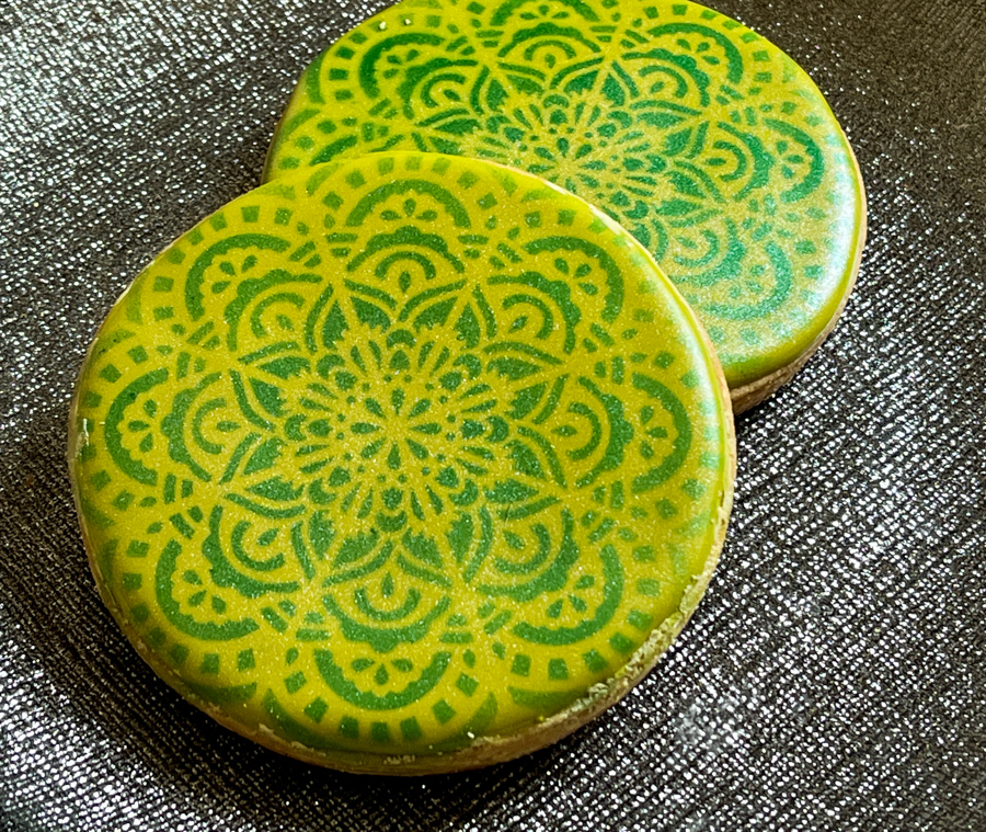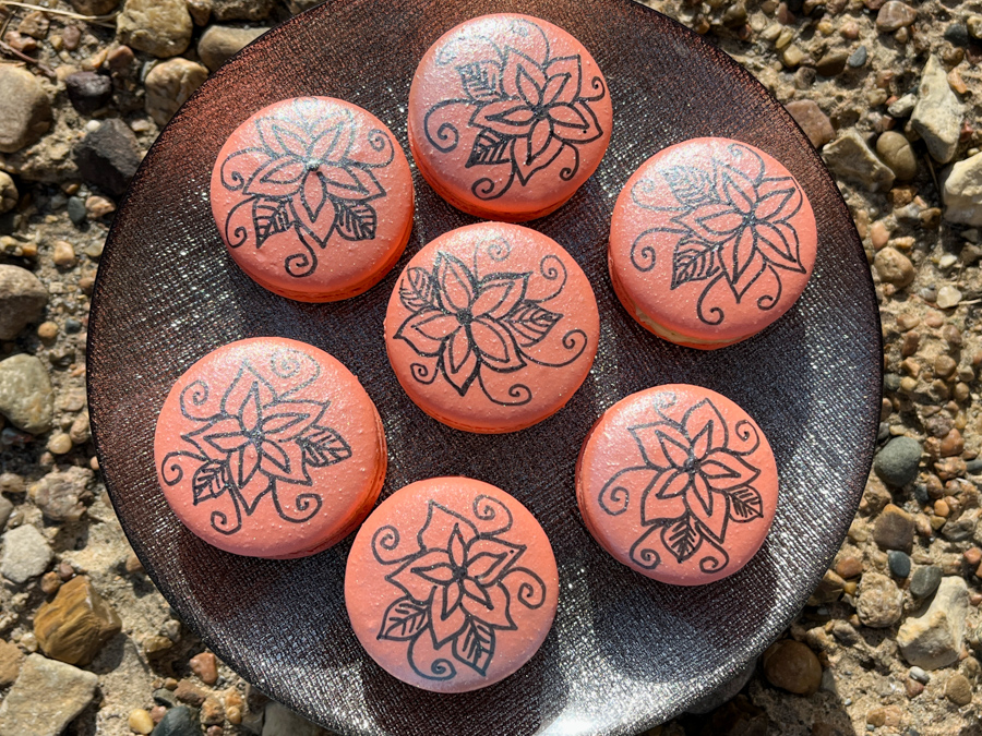 Aritri loved macarons, and these, flavored with Pistachio-Lemon, were decorated with her in mind. Just food-safe pen over the baked shells, and a light spray of PME pearl luster.