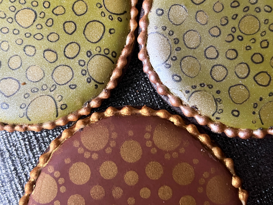 This series was flavored with Fiori di Sicilia, and decorated either with brush embroidery + luster powder painting, or by stamping, a technique I definitely need to practice a bit more.