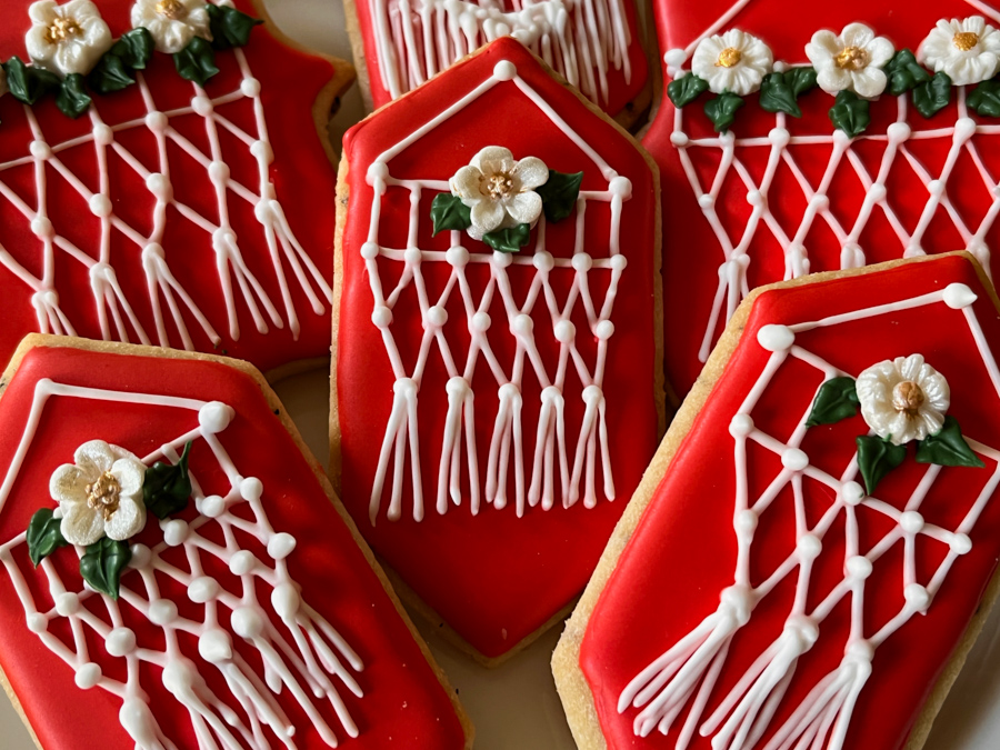 It all starts with a frame-shape cookie cutter flooded in red. Then just eye-ball the design, going down the cookie in rows, as shown in the composite below.