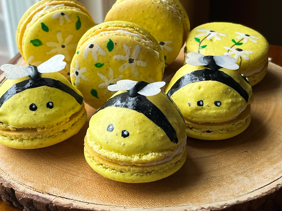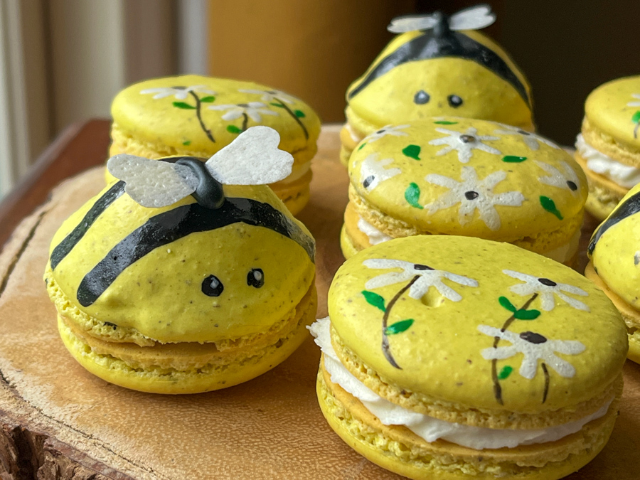 My most recent adventure involved little bees. In this case, I added 10% pecan flour to my default French meringue recipe, and that gave a nice speckled look to the shells. After painting the bee pattern, I glued little wings made with wafer paper. The regular shells were painted with Sugarprism, which was also used for painting the bee’s body.