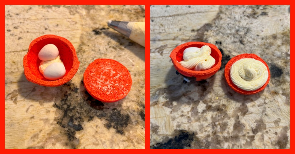 Another consideration is the filling. I did not want to have a big amount of buttercream inside, so for the ladybugs, I included two mini chocolate-Easter eggs to occupy some of the space, and completed with buttercream to close the shells.