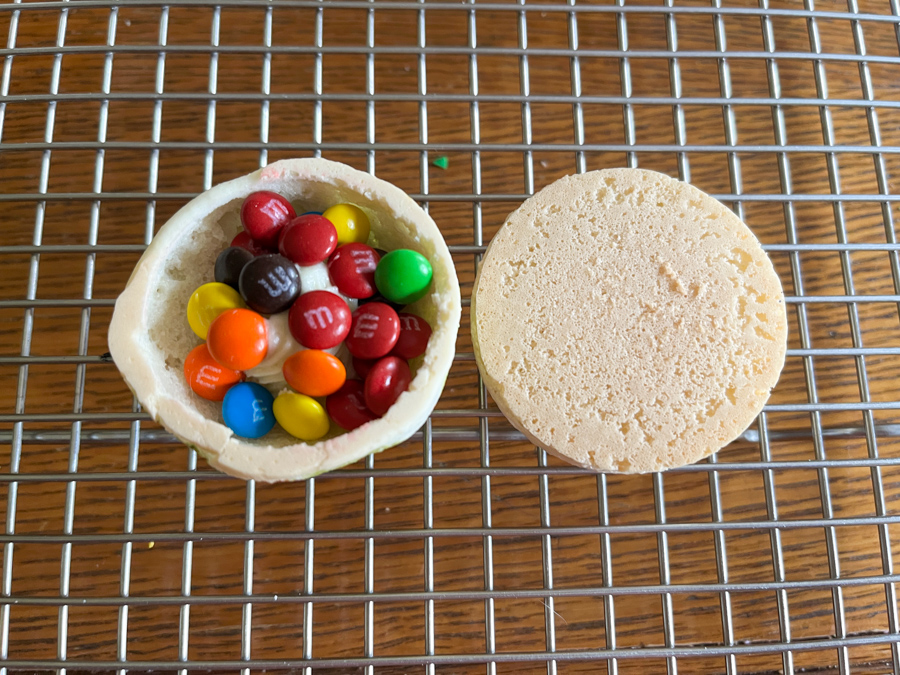 To fill the shells, I used tiny little M&Ms plus a honey-lemon buttercream.