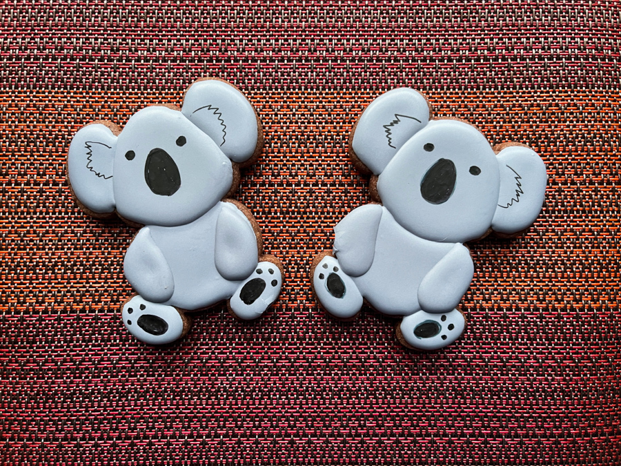 The simplest pair of this set… Koalas… Gray Royal icing flooded in stages, allowed to fully set, and a few details added with food safe pen.