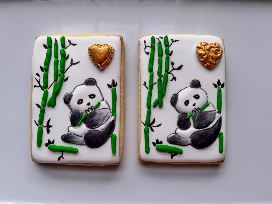 As far as cookie decorating goes, I have two passions: learning new techniques, and making a set of cookies with someone in mind. This small collection was made for a sweet girl who turned 7 years old earlier this month. She loves animals, in fact, her mind is set on becoming a veterinarian when she grows up. Isn’t that super cool? Her Birthday party had Zoo Animals as the theme. I put my cookie mind to work, and made a few to match the theme. I start with a very sweet lion, design by Marlyn. It is made by joining two heart-shaped cookies: one for the head, one for the body. Royal icing transfers help compose his face. I fell in love with this set when I first watched Marlyn making it, so I knew it had to be part of this group. If you are not her supporter on Patreon, you can still see a quick video of this double cookie with a visit to this link on her IG page.