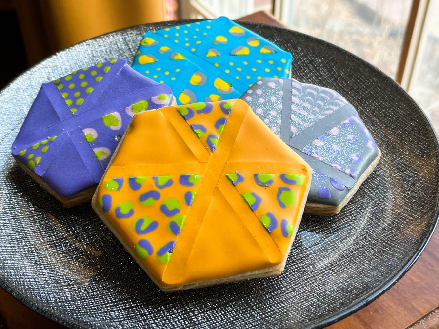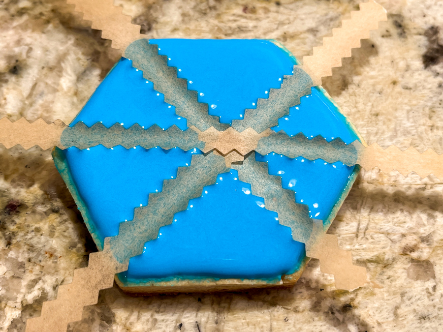 For this tile-cookie, it started with white Royal icing to flood the entire surface, and then the paper stripes were placed in a geometric pattern.