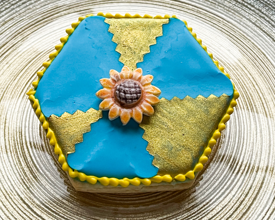 To make this Ukraine-inspired cookie, I cut the strips a little larger, added to turquoise Royal icing, and next day painted some areas with gold. The sunflower is a fondant addition. The picture below show this cookie in its initial stage.