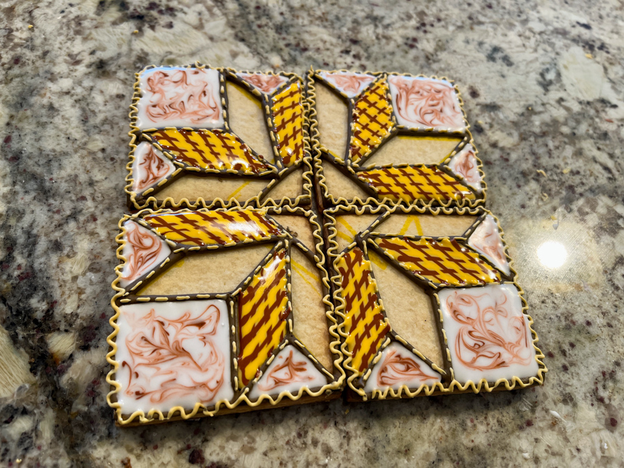 For a geometric pattern such as this to work well, you have to draw guiding lines on the naked cookie as a starting point. Then use piping consistency black to make a reasonably thick outline of all sections, add details with fine lines. As you can see below, I started with a yellow draft but made a few mistakes, so I started all over with a black pen. It all gets hidden by the icing, so no major harm done.
