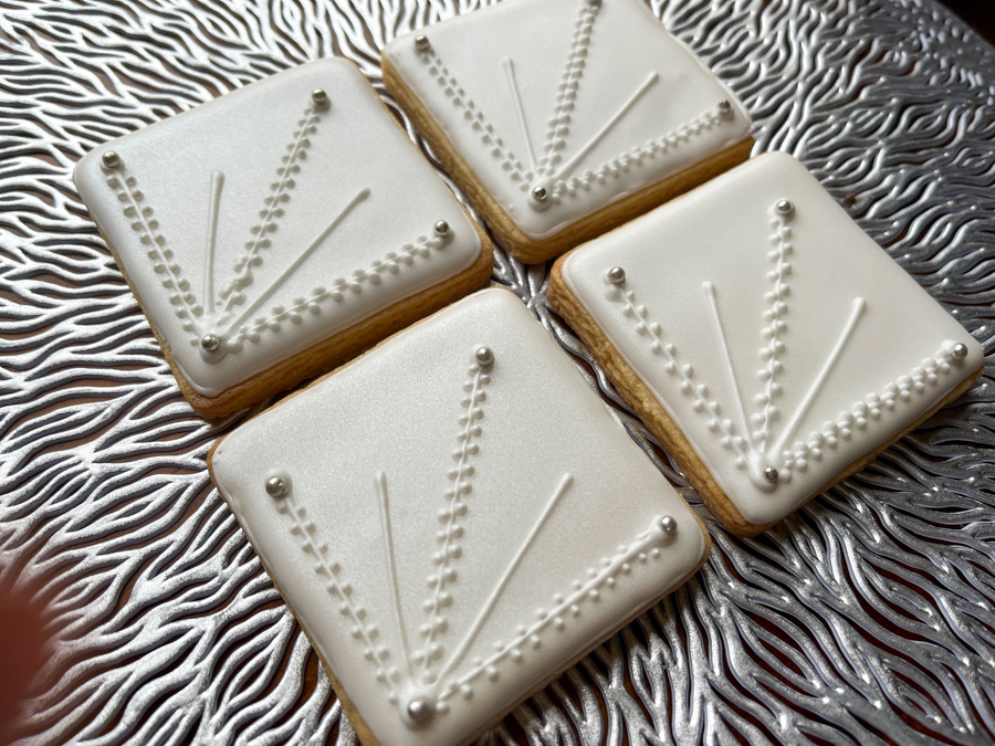 Cookies are flooded with white royal icing, and then the details are piped, with a few silver sprinkles added while the icing is wet.
