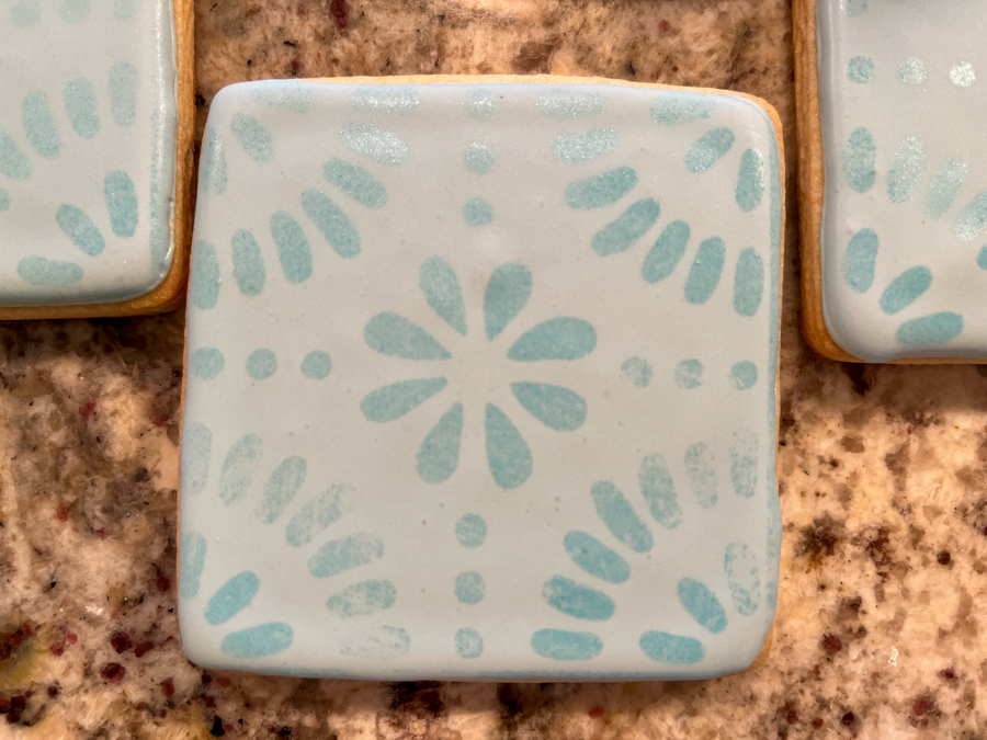 Since the sheen color is so subtle, it does not really interfere with the painting… The sheen color I used is from this set. For these cookies I opted for Blue Sheen.