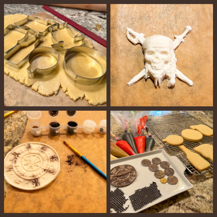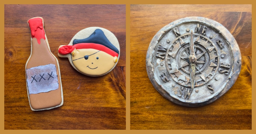 Amy taught us many different techniques in this class. To prepare for it, we needed to bake all cookies, flood the compass one with ivory icing, and prepare all the fondant decorations using molds and then paint them with the “dry dust method” in which luster powder is applied straight to the fondant with a brush. Three different colors of dust worked together to give the aged look of coins and compass. Brilliant! Notice that the pirate’s head is a Christmas ornament cookie cutter. Cute cookie cutter flip…