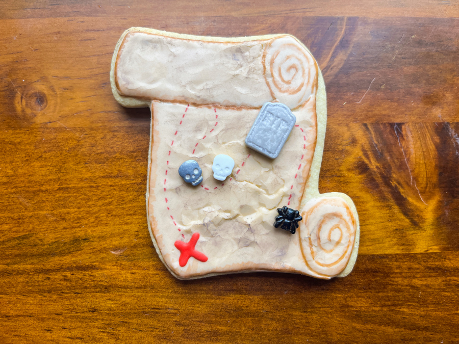 The most elaborate cookie was the treasure chest, maybe… All the small details that Amy planned for it, made it super special in the end. You can see some of the steps below. The cookie cutter used is originally to make an open book, and we did some trimming and shaping with a Microplane before decorating.