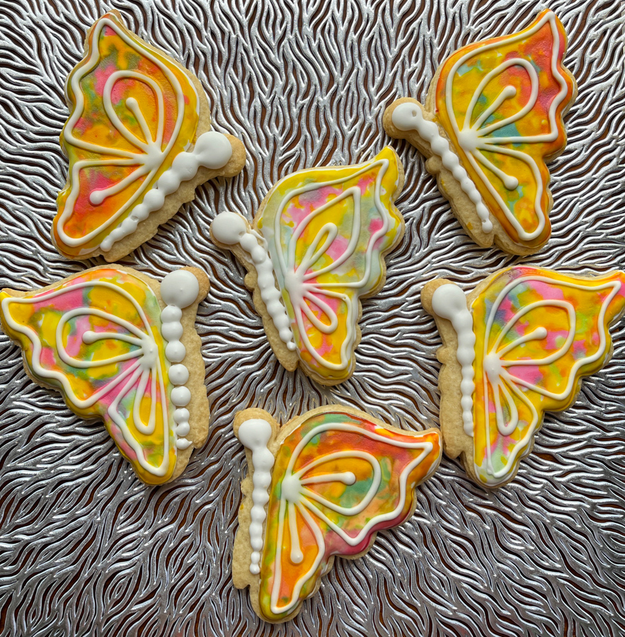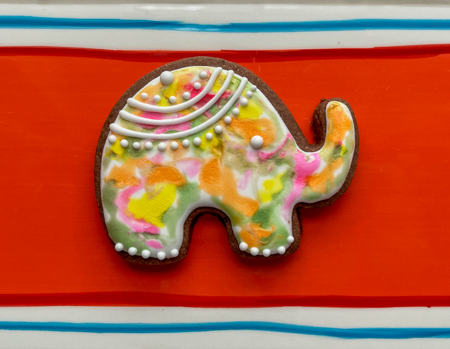 One of the easiest ways to add a lot of color to a cookie is painting the background in watercolor. Often bakers dilute the gel dye with vodka, but I find that water is more user-friendly. The liquid takes longer to dry, which means it is much easier to get the different tones to mingle together, without areas in which the color gets overly intense. The drawback is having to wait a little longer for the painted area to dry, but I think it’s worth it. Today I share three types of cookies that rely on a tie-dye look as starting point.