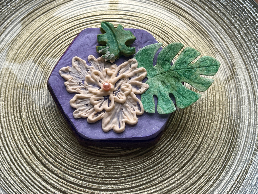Flood with purple. Two-tone stencil with thick Royal icing. Flower is painted fondant. Leaves are fondant and Royal icing transfer.