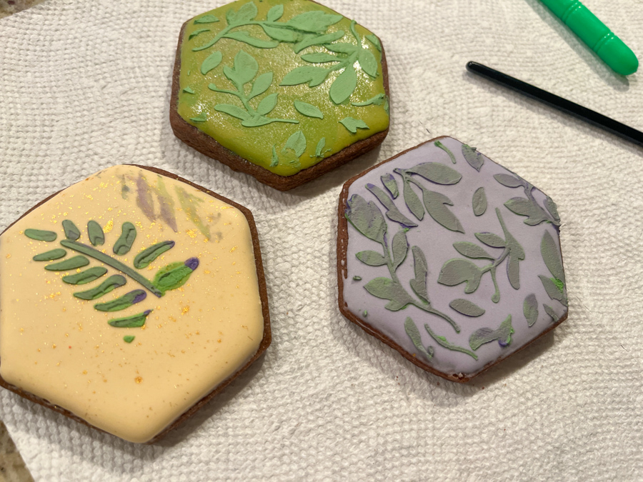 Of all the techniques involved, the one I need to get better at is stenciling with thick royal icing. I have issues keeping the stencil in place (even using the frame to hold it), and making a smooth layer. We did three different cookies, one with a solid color to stencil, and the other two with two-tones (purple and green). I had some issues with each of these three, but in the end they got other decorations on top and I did my best to hide the “boo-boos.”