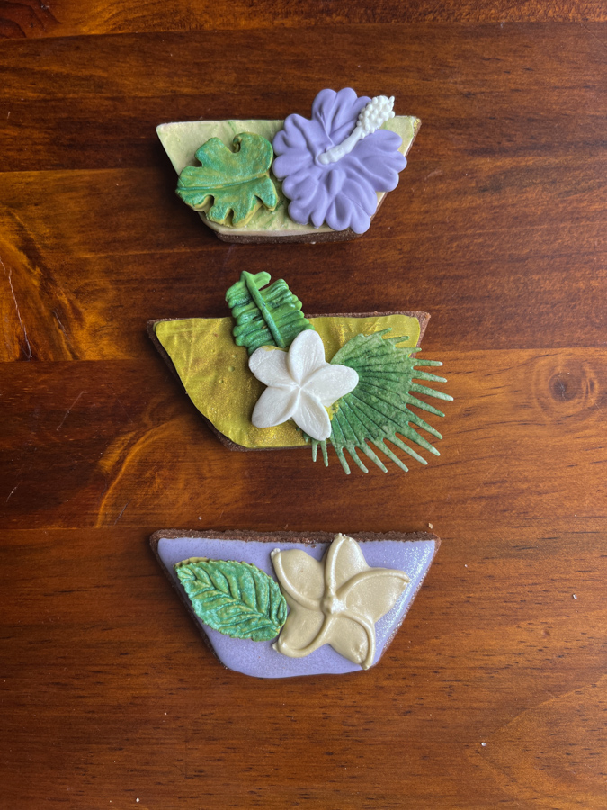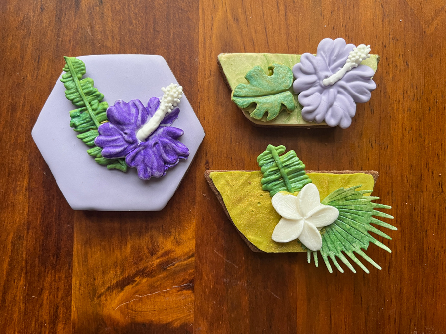Flood with solid purple. Royal icing transfer for hibiscus flower and leaf. Maybe my favorite cookie of the set.