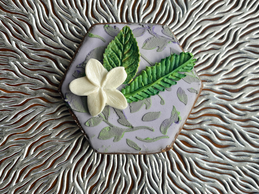 Flood with green and diamond dust for shimmer. Royal icing stencil. Hibiscus flower is Royal icing transfer. Leaf is painted fondant.