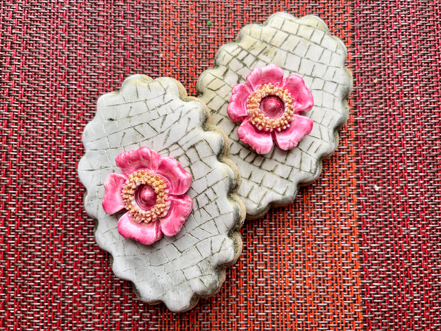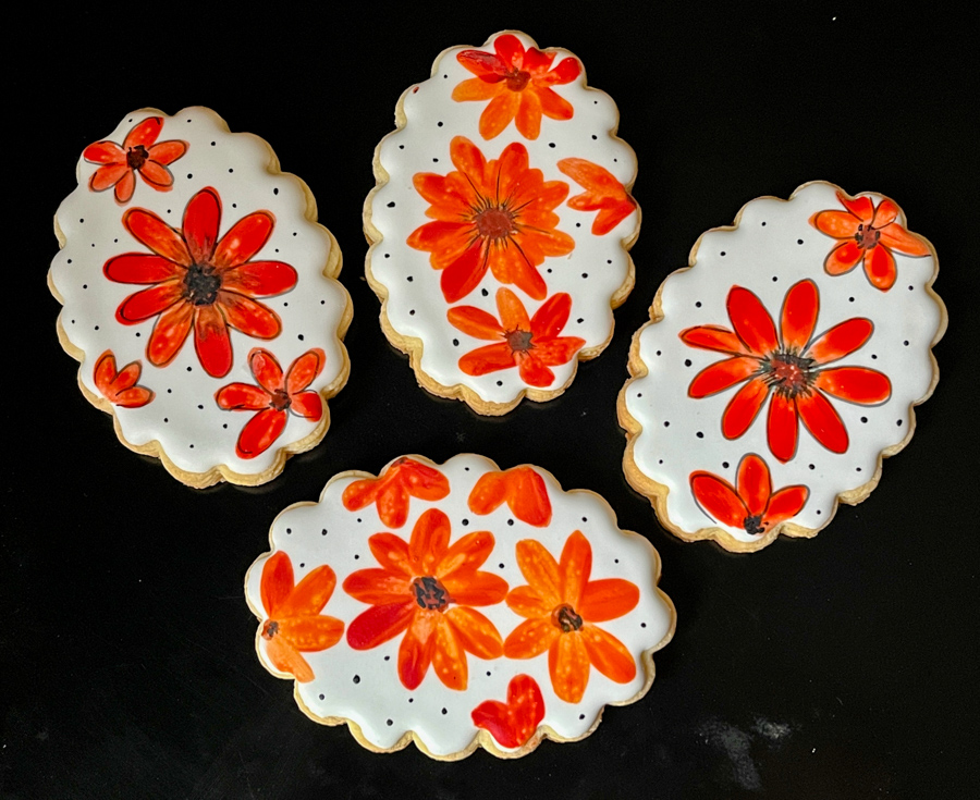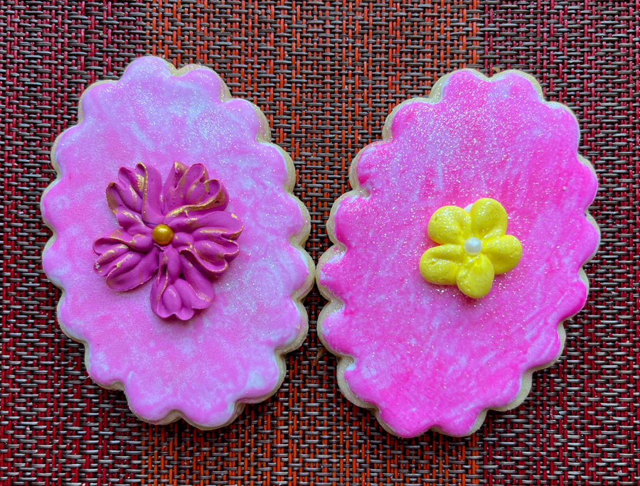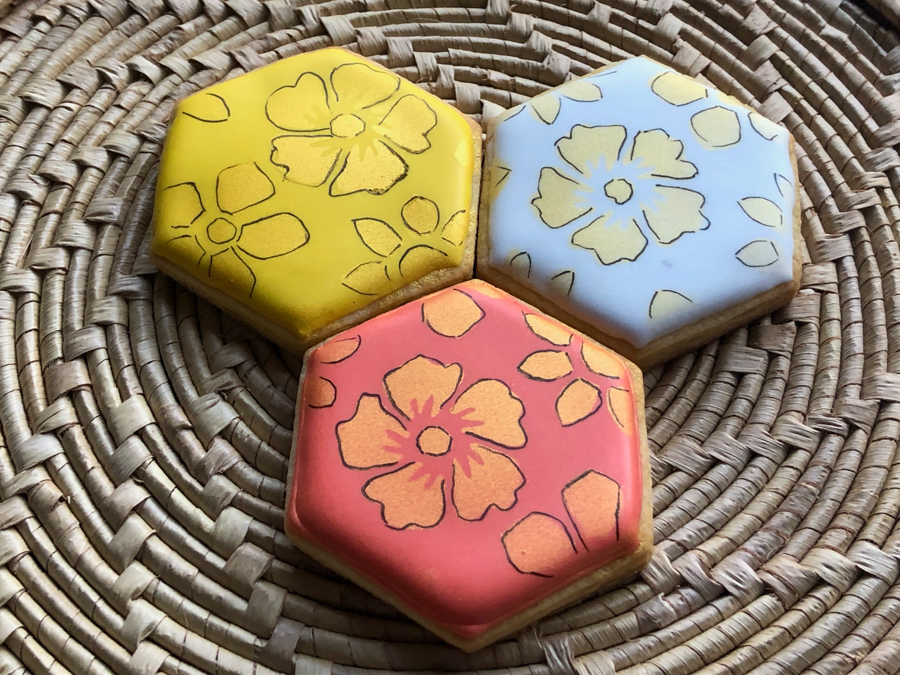 Spring and Summer, time to celebrate color, flowers, being outside and allowing the beauty of the universe to inspire us. I share with you cookies made in the past few weeks, using several different techniques, but all with flowers in mind. I start with my favorite, following as closely as possible a Facebook tutorial from Marlyn. For this one, sequential piping is coupled with air-brushing to bring to cookie-life Plumeria blooms.