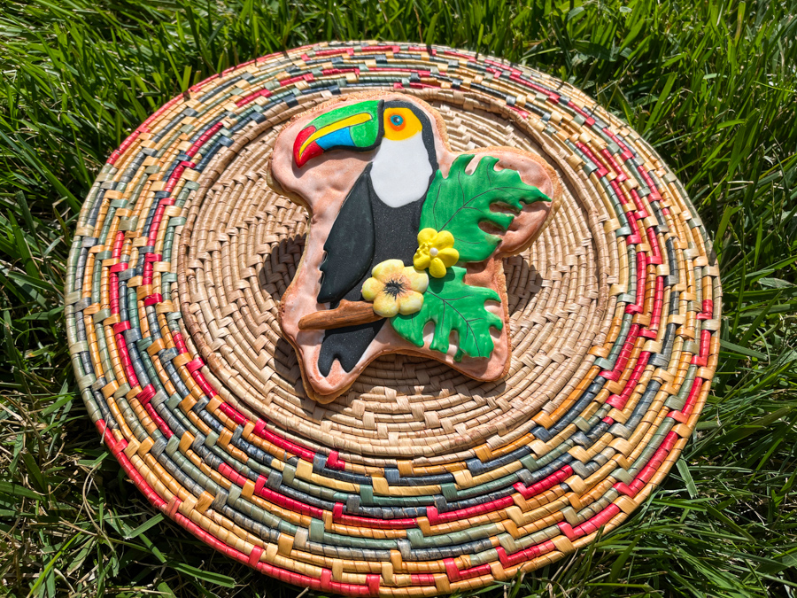 First things first, making all the transfers – either following Amber’s method, or if you prefer to paint, do them all in white first. She has the templates sized perfectly not only to cut the cookie by hand, but to draw the image of the toucan so you can pipe the basic shape and add the transfers. Using paint you can do the beaks with different color combinations. I used Sugarprism and food pen for all components.